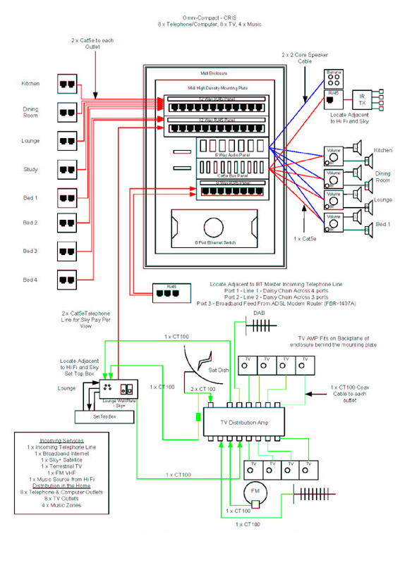 This design provides 8 x Telephone/Computer outlets, 8 x TV outlets and 4 rooms of Music. The system will distribute one telephone line and an internet broadband connection, Sky or Sky+, Terrestrial TV, FM and DAB and Music from a single source.