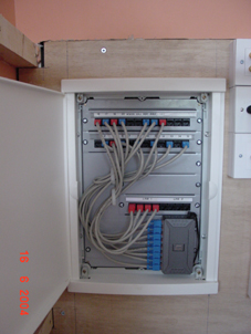 This system uses the CRIS Midi Enclosure with a high density mounting plate. It is populated with 2 x 12 Way RJ45 patch panels, a 6 Way Audio panel and a 10 Way Krone Panel. It has an 8 port Ethernet Switch and is ready for a Broadband Modem/Router to be connected.