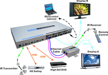 The Octava 4x4 HDMI - Ethernet CAT 5/6 Matrix Router allows you to route 4 HD sources to any 4 HD displays over HDMI or CAT 5/6 Ethernet cables! The 4x4 HDMI matrix allows 256 viewing combination of 4 HD sources on 4 HDTV's. In addition, Infrared Extension allows I.R. signals to be sent from viewing area to the equipment room over CAT-5/6 Cables.